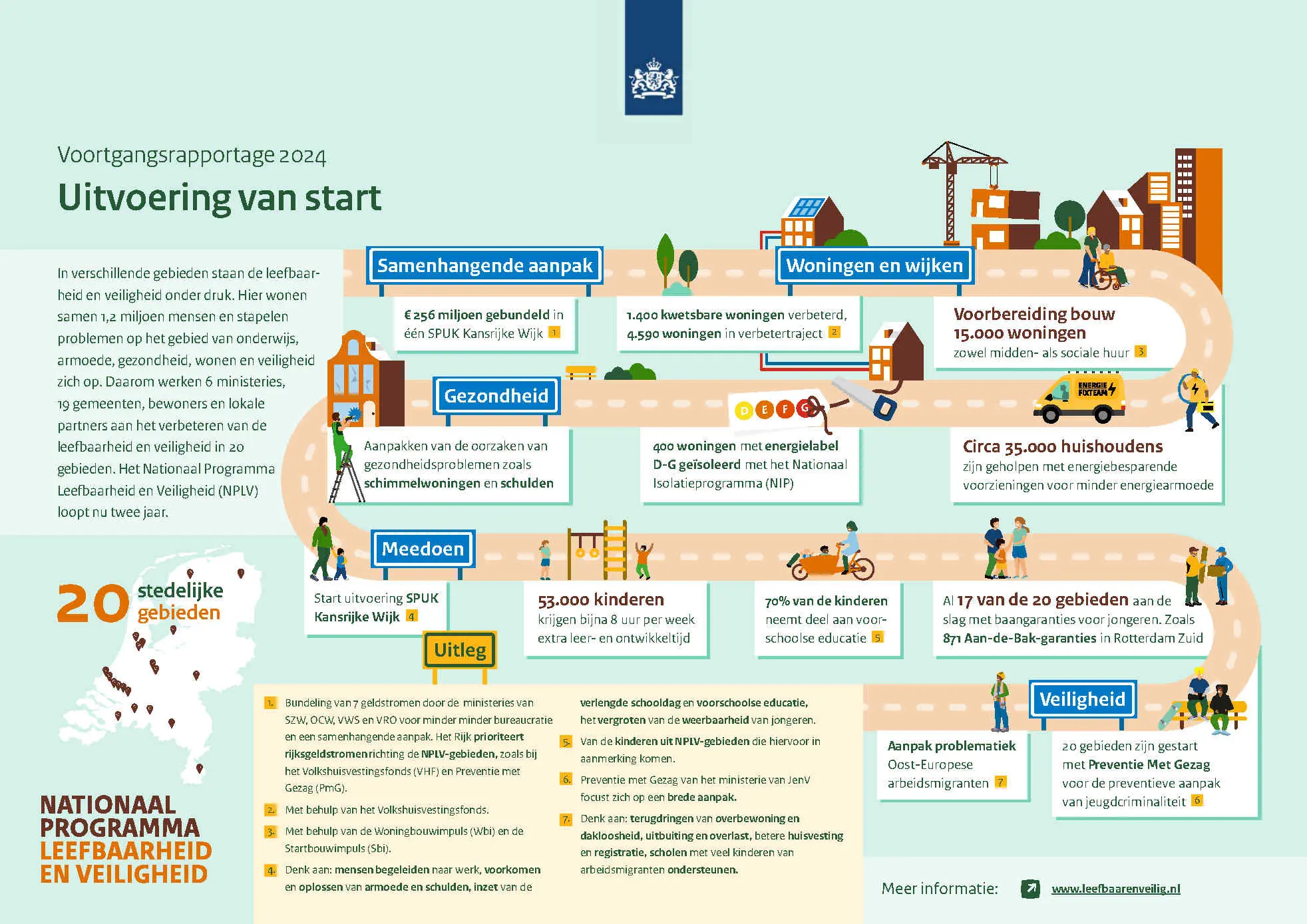 Bouwen, verduurzamen en baangaranties helpen de leefbaarheid en veiligheid te verbeterenIn de 20 gebieden van het Nationaal Programma Leefbaarheid en Veiligheid (NPLV) is de bouw van 15.000 woningen in voorbereiding, zowel sociale huur als middeldure huur. Daarnaast krijgen circa 53.000 kinderen in NPLV-gebieden gemiddeld 8 uur per week extra leer- en ontwikkeltijd aangeboden. 17 van de 20 gebieden zijn aan de slag met baangaranties voor jongeren. Ook zijn alle gebieden begonnen met extra inzet voor de preventie van jeugdcriminaliteit.