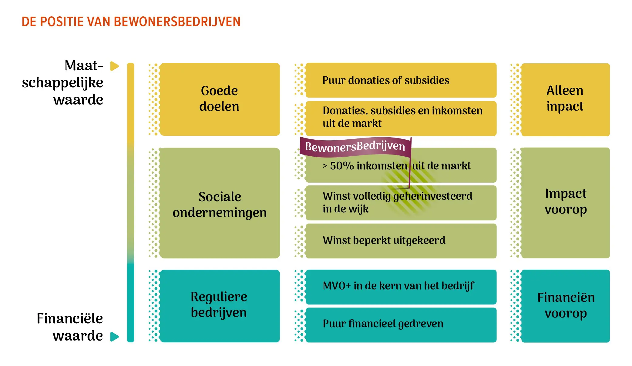 Bewonersbedrijven nemen een unieke plek in binnen het spectrum van maatschappelijke initiatieven en organisaties. Ze balanceren op het snijvlak van sociale en financiële waarden, waarbij ze een levensvatbare balans zoeken tussen betaalde opdrachten uit de markt en subsidies van overheden en fondsen. In tegenstelling tot veel goede doelen, die voornamelijk op donaties draaien, en reguliere bedrijven, die winst als primaire doelstelling hebben, zijn bewonersbedrijven echt geworteld in de gemeenschap. Ze streven naar maatschappelijke verbetering door hun werk te richten op de wijk. Eventuele winsten worden direct geïnvesteerd in de wijk, zoals het opknappen van speeltuinen of het organiseren van activiteiten voor kinderen uit minderbedeelde gezinnen. Dit concept van ondernemerschap geeft bewoners niet alleen eigenaarschap, maar zorgt ook voor een duurzame ontwikkeling van de buurt.