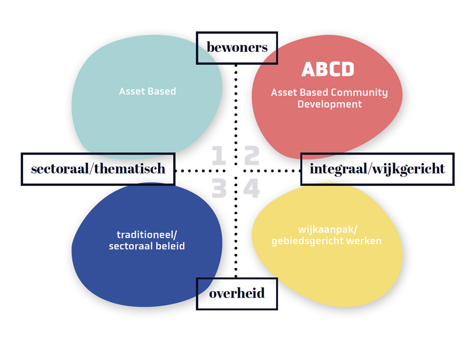 Het model bestaat uit vier kwadranten: blauw staat voor traditioneel sectoraal beleid, rood vertegenwoordigt de ABCD-methode (Asset-Based Community Development), en geel staat voor wijkaanpak en gebiedsgericht werken. Door steeds de relatie tussen de kwadranten te leggen, wordt gezorgd dat zowel beleid als de gemeenschap een stem krijgen in de besluitvorming. Vanuit de praktijk blijkt dat deze benadering zorgt voor heldere kaders waarin beleidsmakers én bewoners hun eigen rol kunnen vinden. Van Geel benadrukt: “In plaats van vakambtenaren die vanuit hun ‘eiland’ opereren, helpt het model hen om procesvaardigheden te ontwikkelen en bruggen te slaan naar de leefwereld van de gemeenschap.”