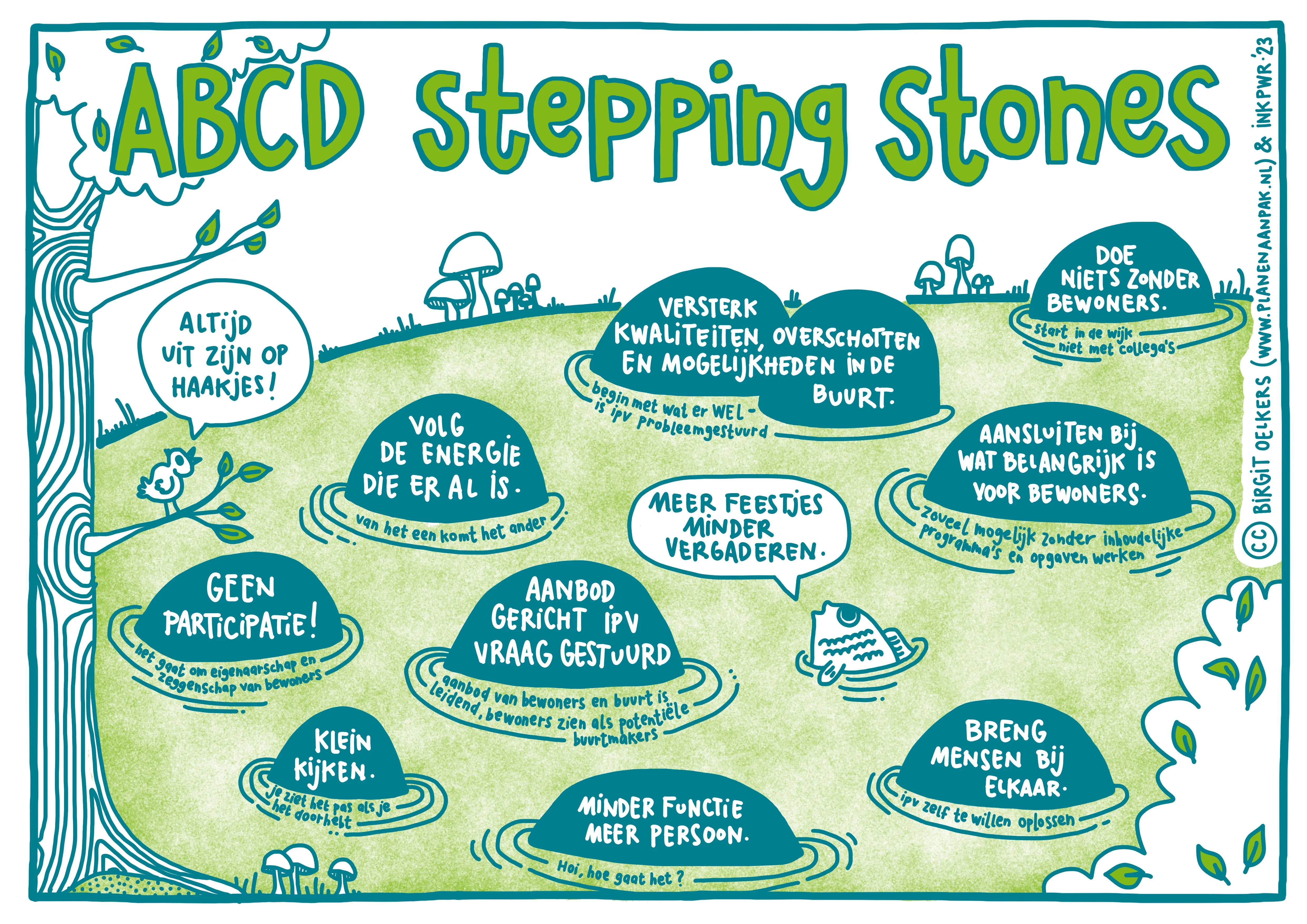 ABCD is geen methode, het is een verzameling principes. Dat houdt in dat je met ABCD niet vertrekt vanuit een doorwrocht project- en stappenplan, maar dat je met een goed getrainde houding op pad gaat. De poster ABCD Stepping Stones maakt inzichtelijk wat die principes zijn die ten grondslag aan die houding liggen.
