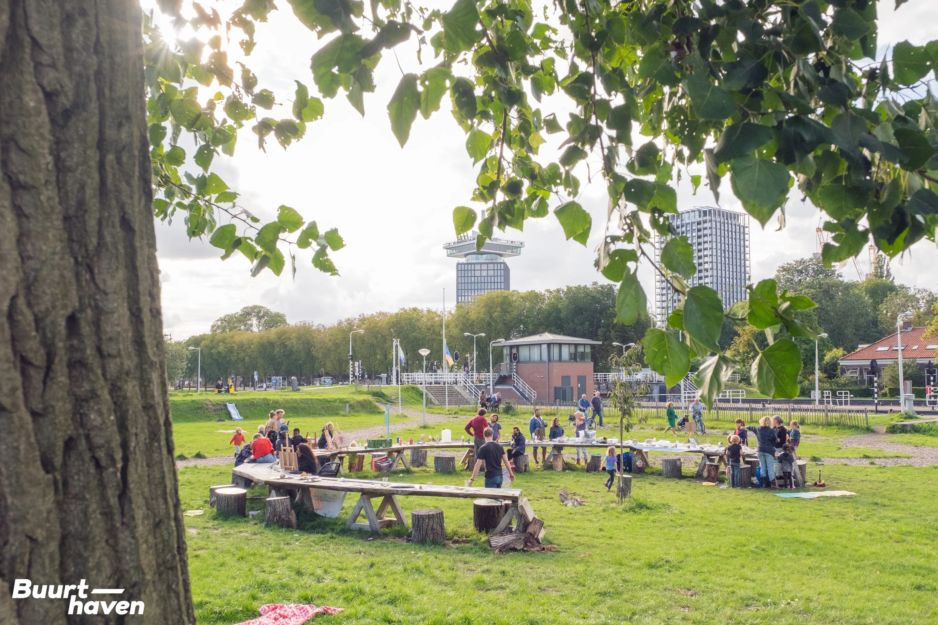 Middenin het snel veranderende Amsterdam Noord ligt op één van de meest centrale plekken een groene, vrije ruimte aan het water. Lange tijd lag dit terrein braak en werd er onder de grond druk gebouwd aan de befaamde Amsterdamse Noord/Zuid lijn. Maar sinds enige tijd is het hekwerk weg en valt, bij het oversteken van de sluis richting het IJplein, meteen een ronde buurttafel van tien bij tien meter op.