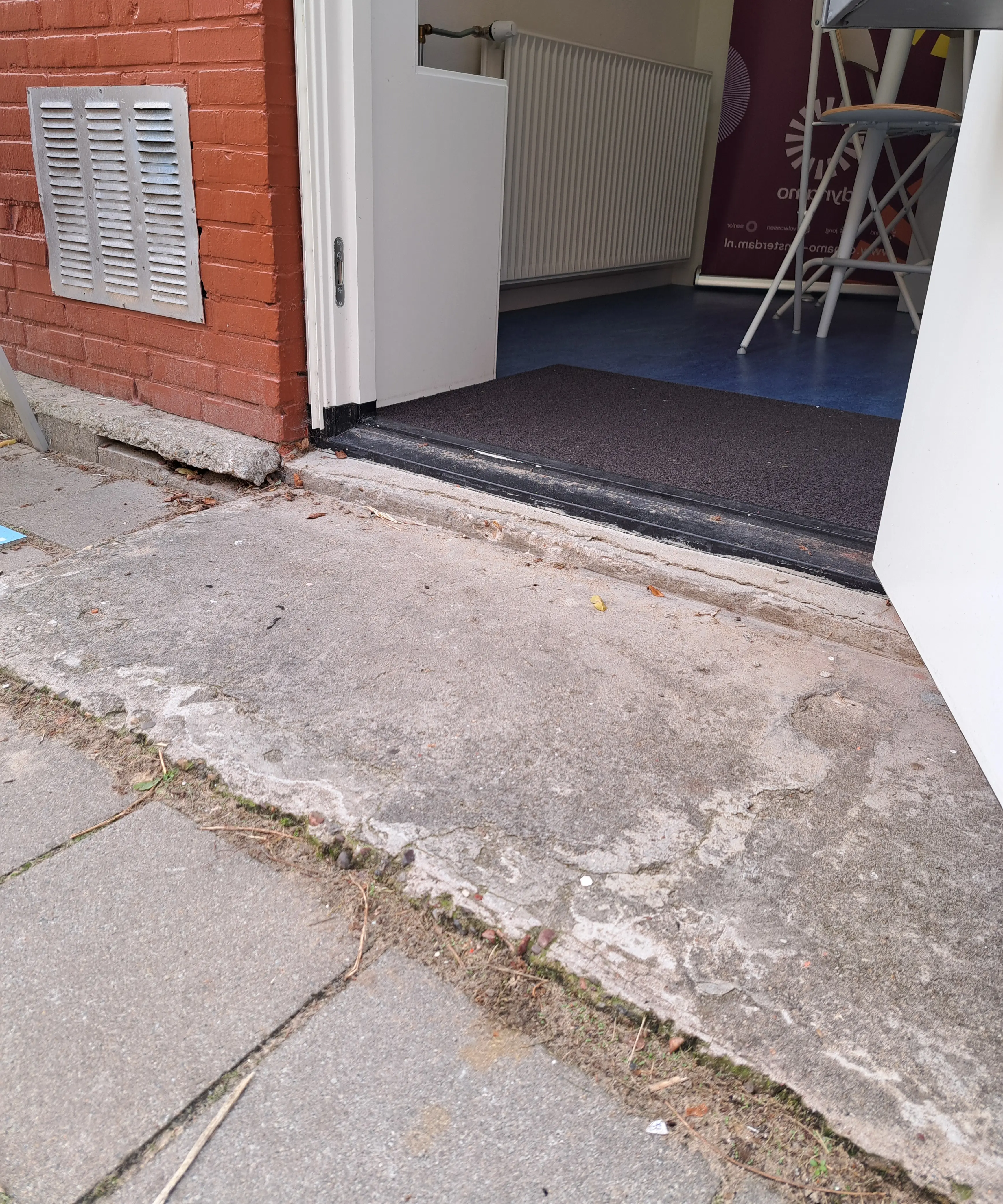 Voorbeelden van verhogingen die de bruikbaarheid en betreedbaarheid van buurthuizen door mensen met een fysieke beperking belemmeren.