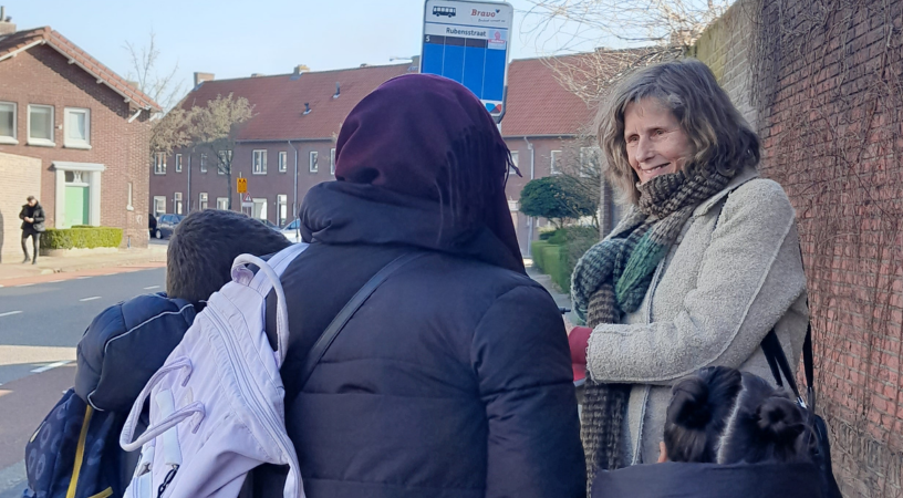 We ontmoeten Nienke in de gloednieuwe Buurtontmoeting Trompstraat 2a in Oud-Woensel. Sinds twee jaar organiseert Nienke hier taalles. Eerder deed zij dit al vanuit een andere wijk in Eindhoven, waar Lydia van Dinteren (docent-onderzoeker Social Work) een jaar woonde voor haar etnografische onderzoek. Lydia zag toen van dichtbij hoe Nienke zich actief inzette voor kwetsbare inwoners in deze wijk. Zij was onder de indruk van Nienke. In een voorgesprekje vertelt Lydia wat haar is opgevallen: ‘Mijn onderzoek in de wijk laat zien dat bewoners de professionals missen in de wijk en dat professionals weinig zichtbaar aanwezig zijn in de wijk. Nienke is daarop een uitzondering in mijn ogen. Met haar tomeloze energie trekt zij steeds weer de wijk in, ook op een zondagmiddag, ook als het regent.’