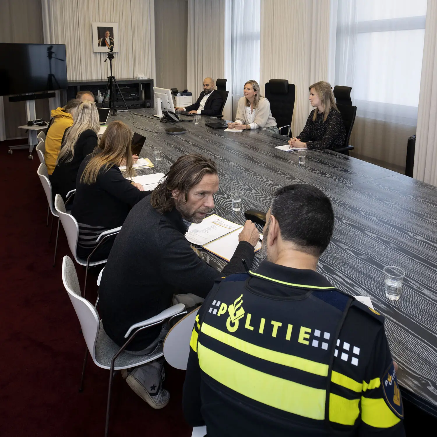 De bijzondere setting van een wijkrechtspraak, Eindhoven. Alle betrokkenen, behalve de verdachte zelf, zijn aanwezig. Anders dan bij een gewone rechtszaak zitten bij een zaak van de wijkrechter alle betrokkenen aan een ovalen tafel en anders dan bij een gewone rechtszaak zijn hier—naast de rechter, de griffier, de Officier van Justitie, de verdachte en de advocaat—verschillende hulpverleners aanwezig.